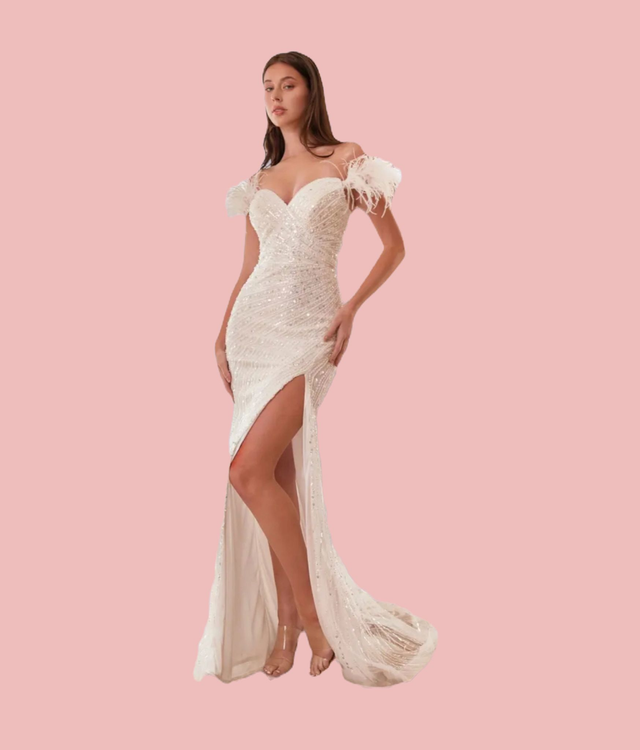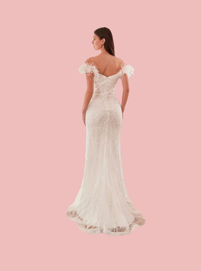 Eblouissez vos invités avec la robe de mariée sirène fendue "Ladivine" de la collection "Cinderella". Cette robe exquise est entièrement ornée de strass, perles et sequins, ajoutant une touche de glamour à votre look de mariée. Les bretelles tombantes sur les épaules sont ornées de plumes délicates de marabout, ajoutant une touche de douceur et de féminité à cette robe sensationnelle. La fermeture éclair invisible dans le dos crée une finition élégante et assure un ajustement parfait. Avec la robe "Ladivine", vous serez sûre de faire une entrée remarquable le jour de votre mariage.