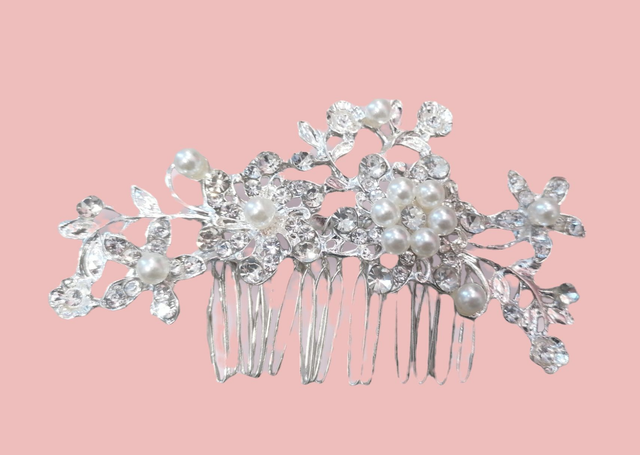 Ce superbe peigne à cheveux est orné de perles délicates, de cristaux et de détails floraux argenté, peigne fantaisiste qui mettra une touche finale à votre coiffure. Que vous portiez vos cheveux en chignon ou en mèches fluides, ce magnifique peigne à cheveux rehaussera sans effort votre look de mariée.